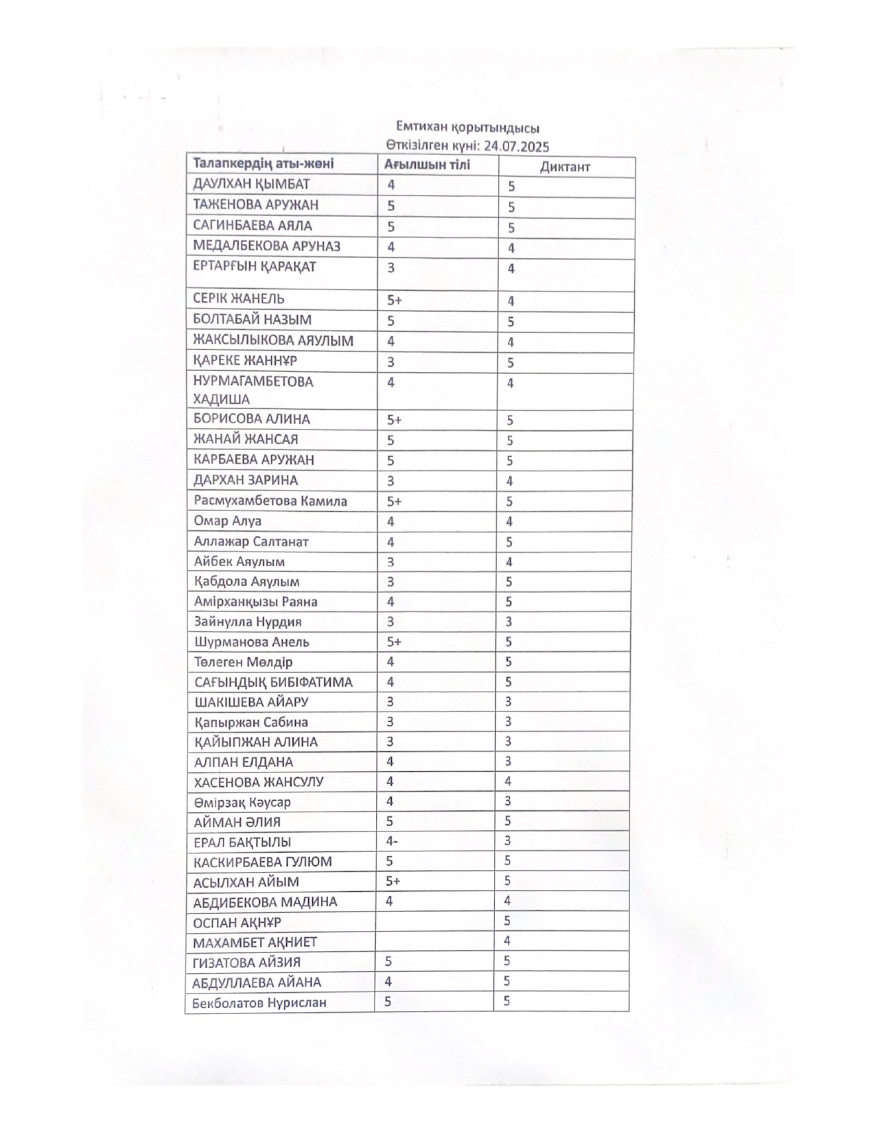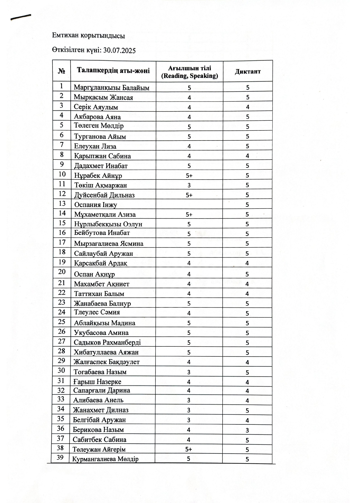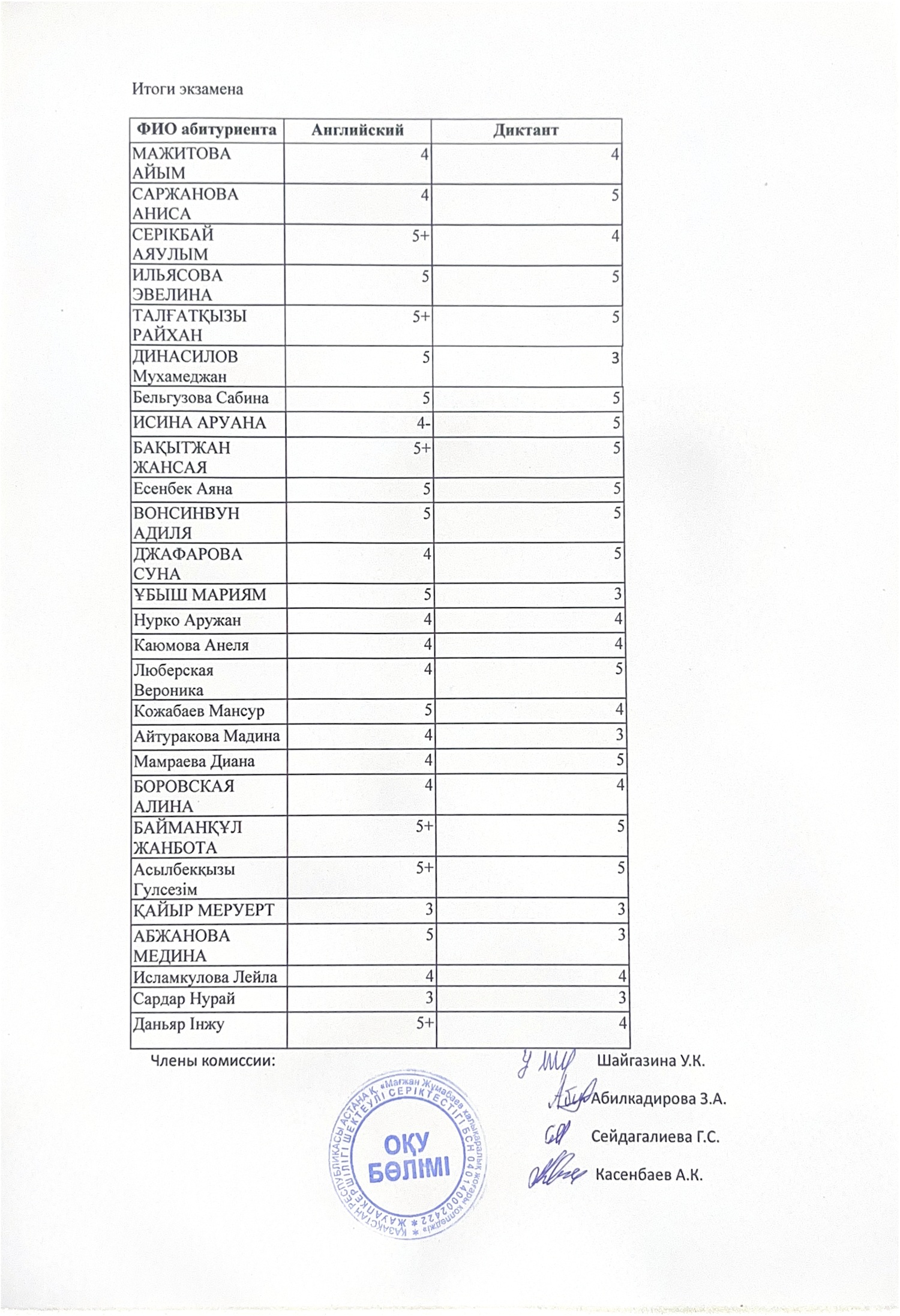 Результаты экзаменов по специальности 01140600 «Педагогика и методика преподавания языка и литературы основного среднего образования» квалификации 4S01140605 «Учитель иностранного языка»